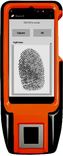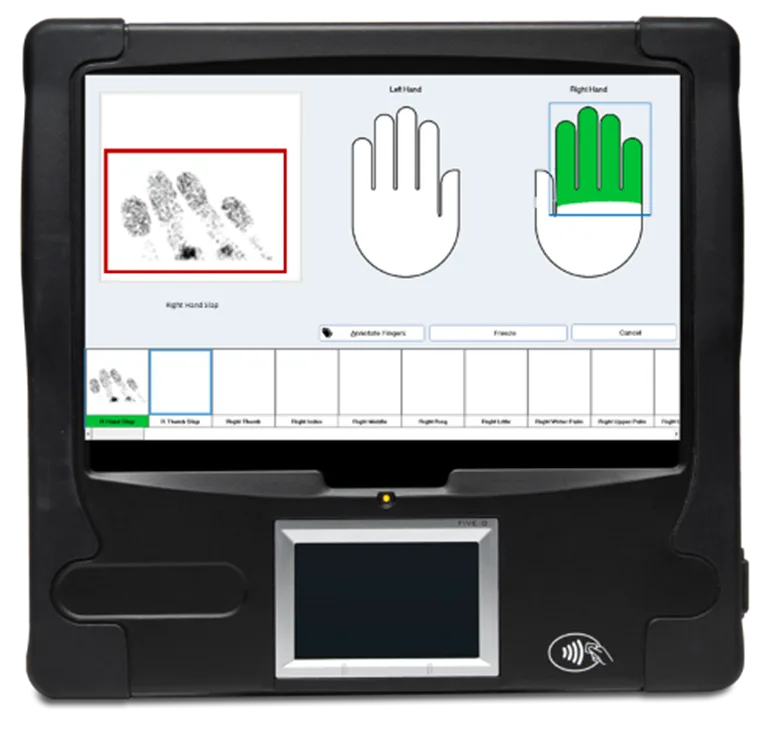 A tablet-based, portable device with an integrated tenprint scanner to capture rolled and flat fingerprints, along with facial images, irises (optional), and descriptor data. It includes an industrial grade polycarbonate/rubber case, Wi-Fi and cellular communication capabilities and built-in GPS.